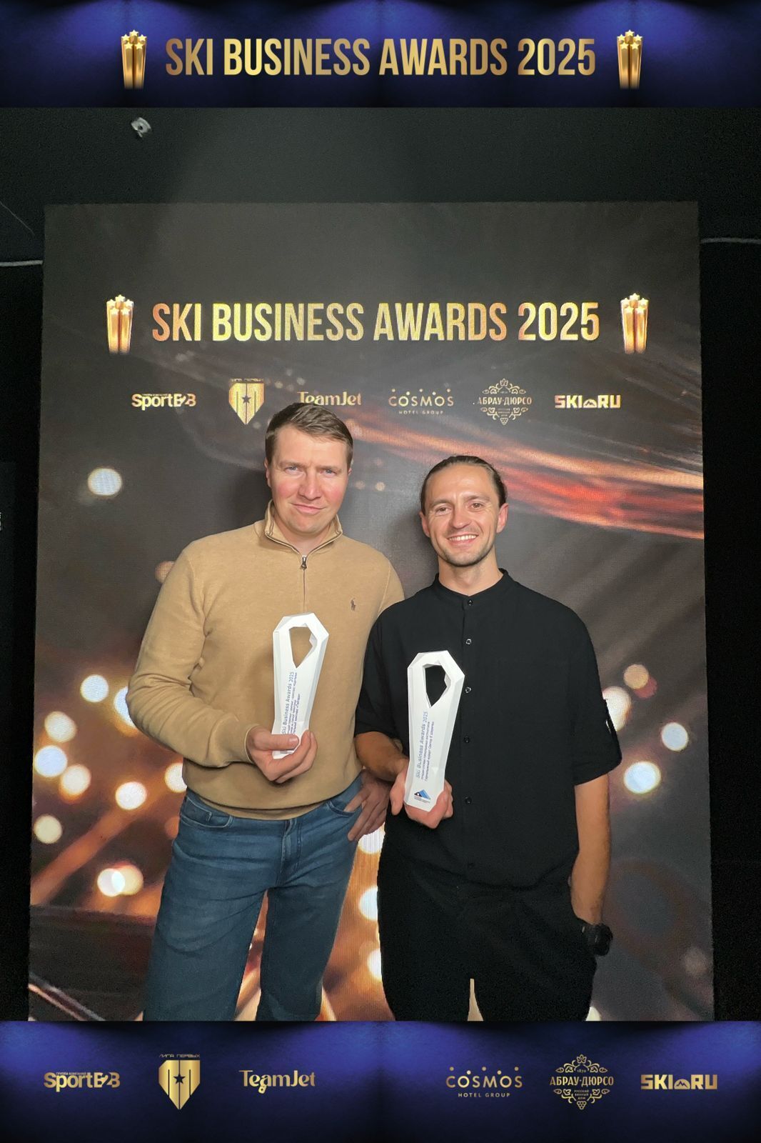 Вадим Кулубеков, владелец Сектора Е (слева) и Кирилл Борков, руководитель школы "Пошли кататься!" (справа) с наградами на SKI BUSINESS AWARDS 2025